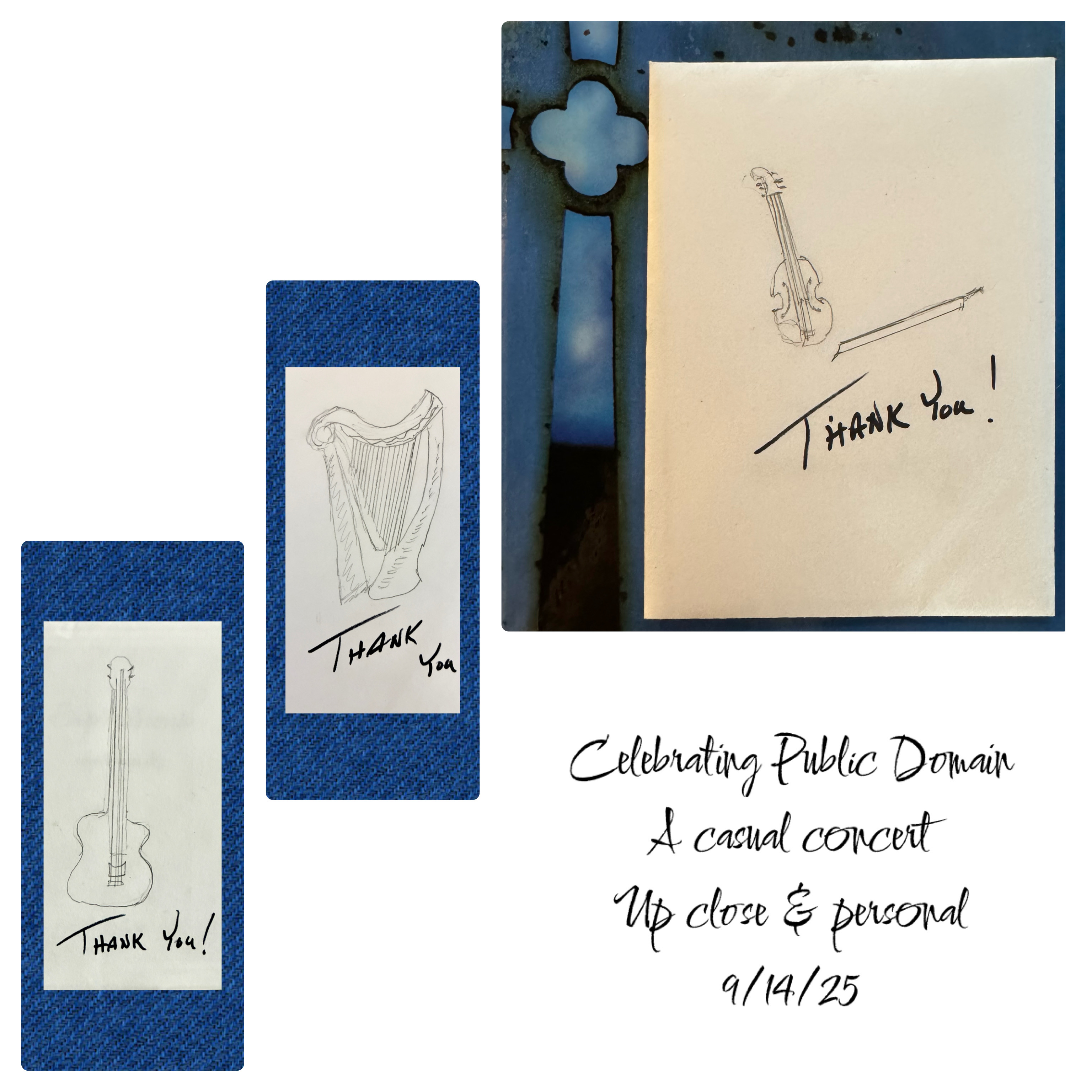 Following a house concert, our trio found beautifully decorated envelopes with a short, personal thank you notes tucked on our music stands. Simple. Not costly, but a gift of time and effort. A thank you that lingers, not only in a memory, but in a hand, tucked on the shelf, or between pages of music. Precious.